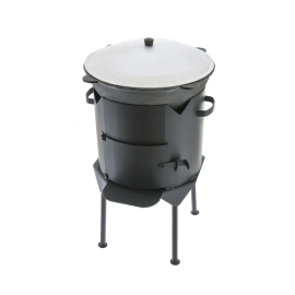 Входящий в набор очаг имеет четыре устойчивые съёмные ножки, дверцу и отсоединяемый дымоход с заслонкой. Конструкция дымохода даёт возможность регулировать подачу кислорода в процессе горения, тем самым изменяя температуру в нужную сторону. Наличие стальной дверцы предотвращает выпадение горячих углей и гарантирует полностью безопасную эксплуатацию очага. Печь может использоваться с другой посудой (сковородами, саджами, казанами объёмом 11-15 литров).